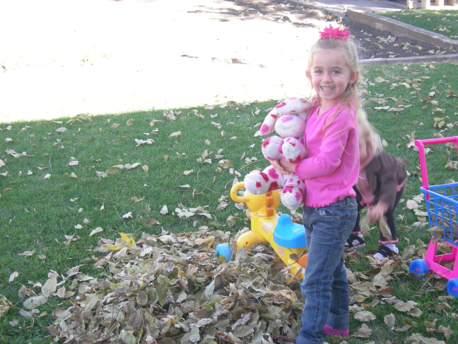 Not only do we jump in the leaves, but we also fill anything and everything we can find with them too! Notice the shopping cart by Lucy is full of leaves!